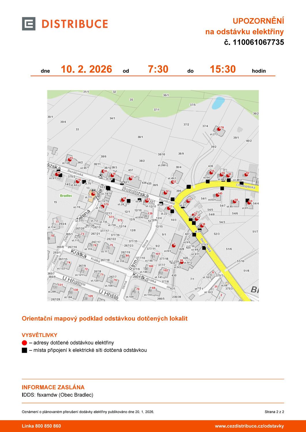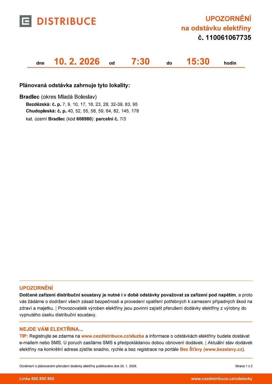 Oznamujeme, že dne 10.02.2026 od 7:30 do 15:30 je plánované přerušení dodávky elektrické energie v následujících lokalitách: